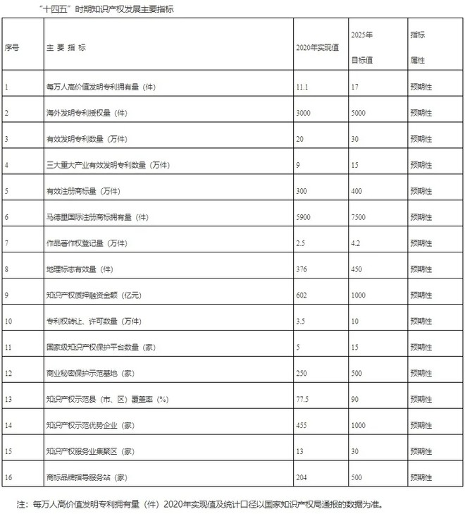 例如,《规划》提出,到2025年,每万人高价值发明专利拥有量达到17件、海外发明专利授权量达到5000件、有效发明专利数量达到30万件、三大重大产业有效发明专利数量达15万件、知识产权质押融资金额达1000亿元,与2020年实现值相比,5年增幅分别达53.2%、66.7%、50%、66.7%和66.1%。